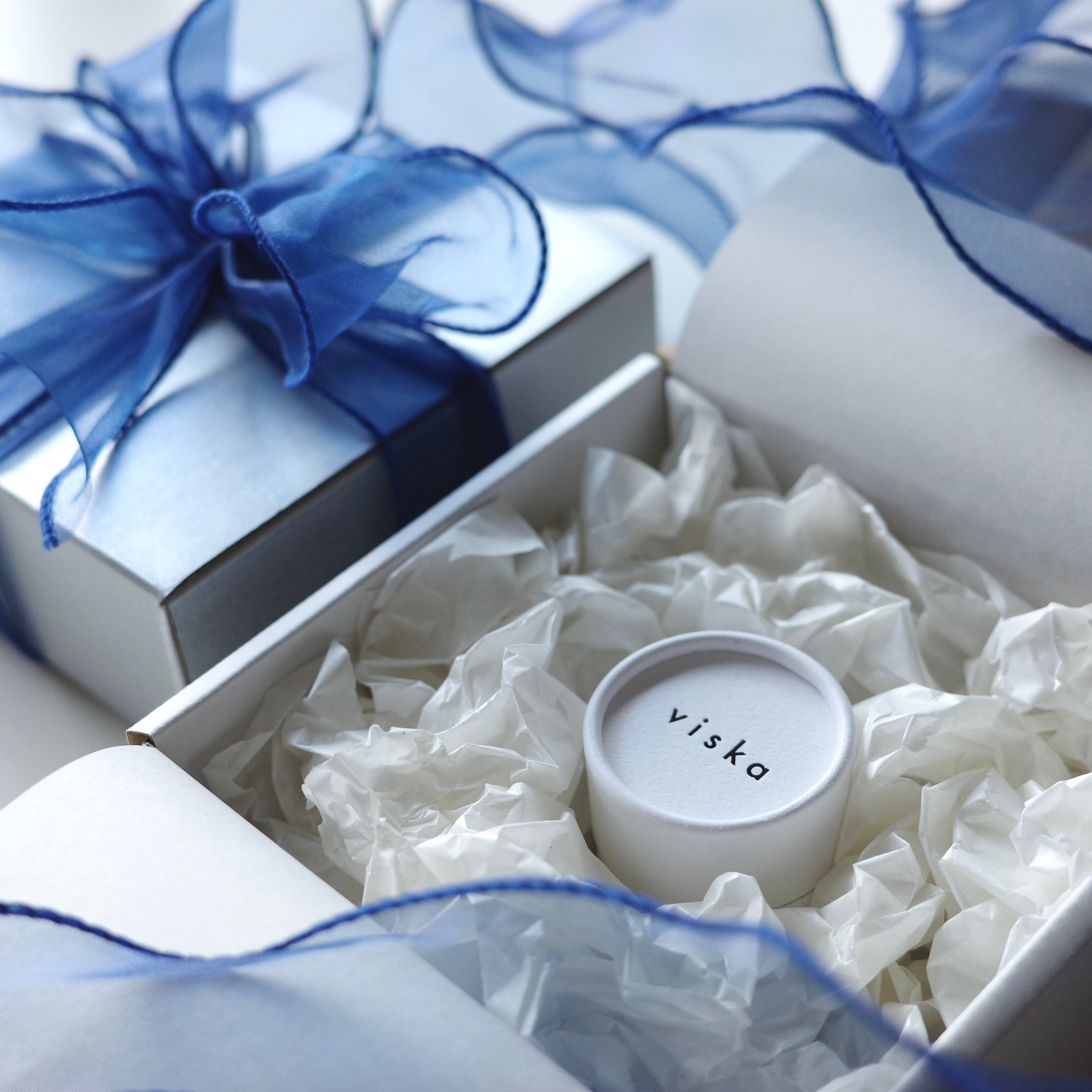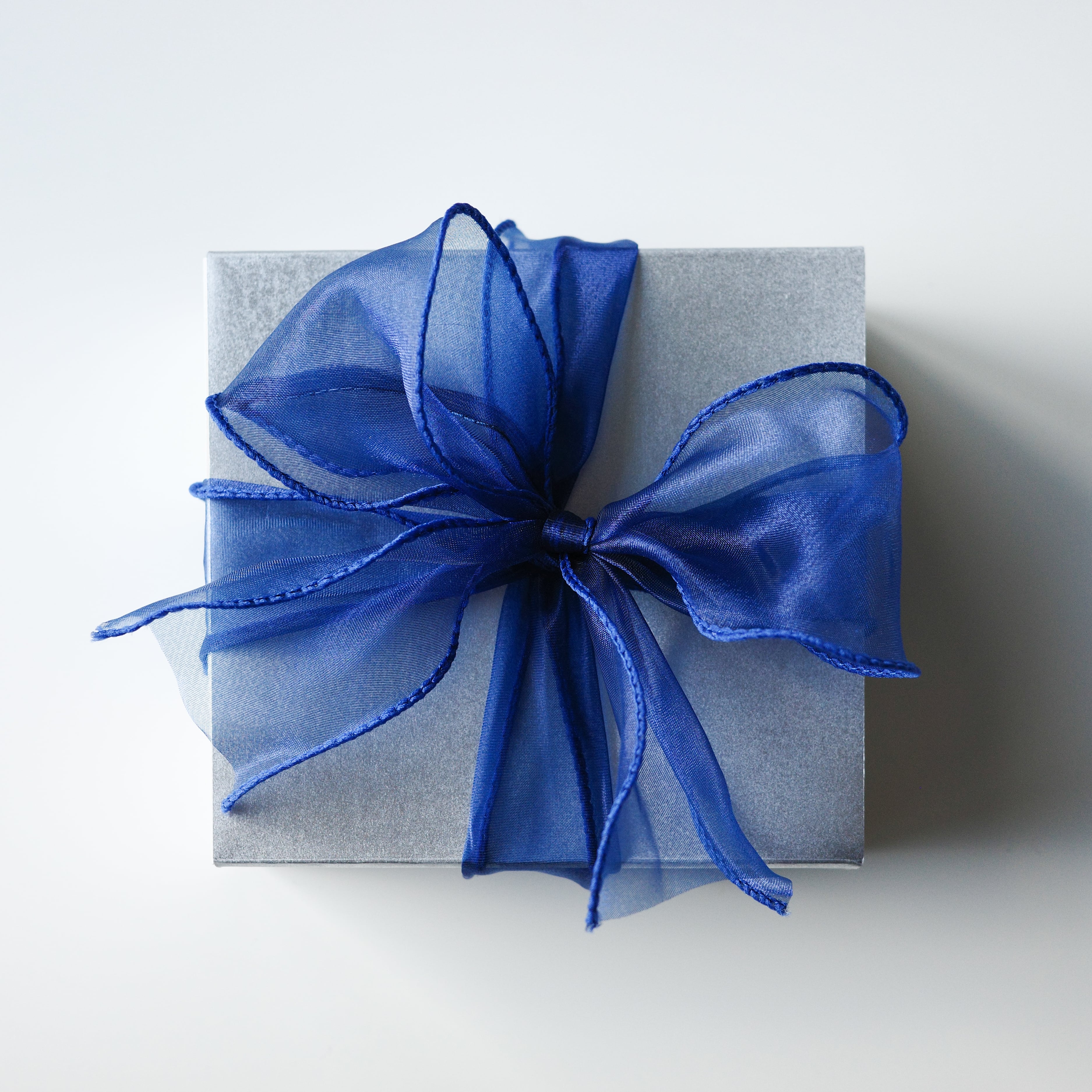 アイテムをパール紙で包み、シルバーのボックスにブルーの大きなリボンをかけてお届けします。