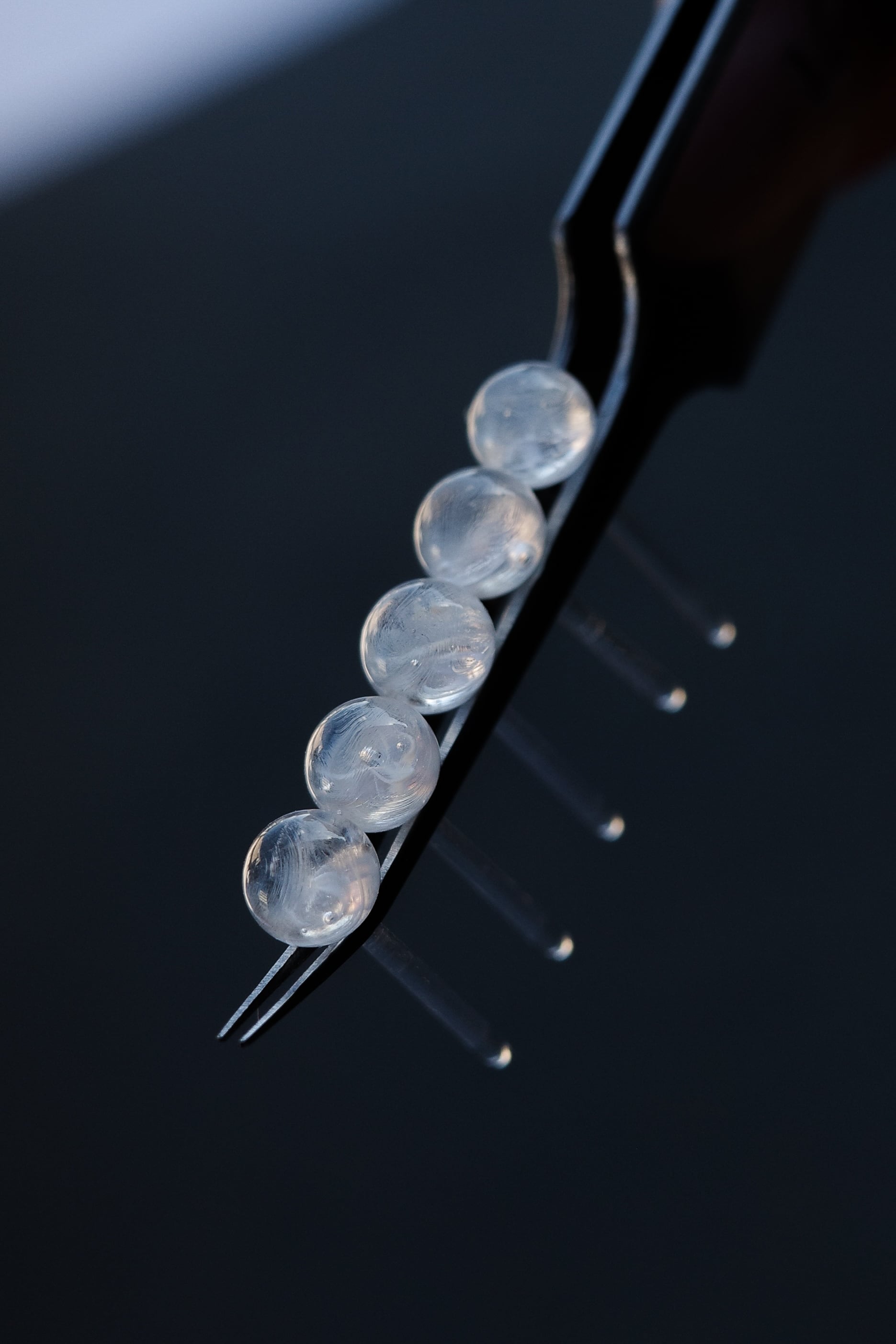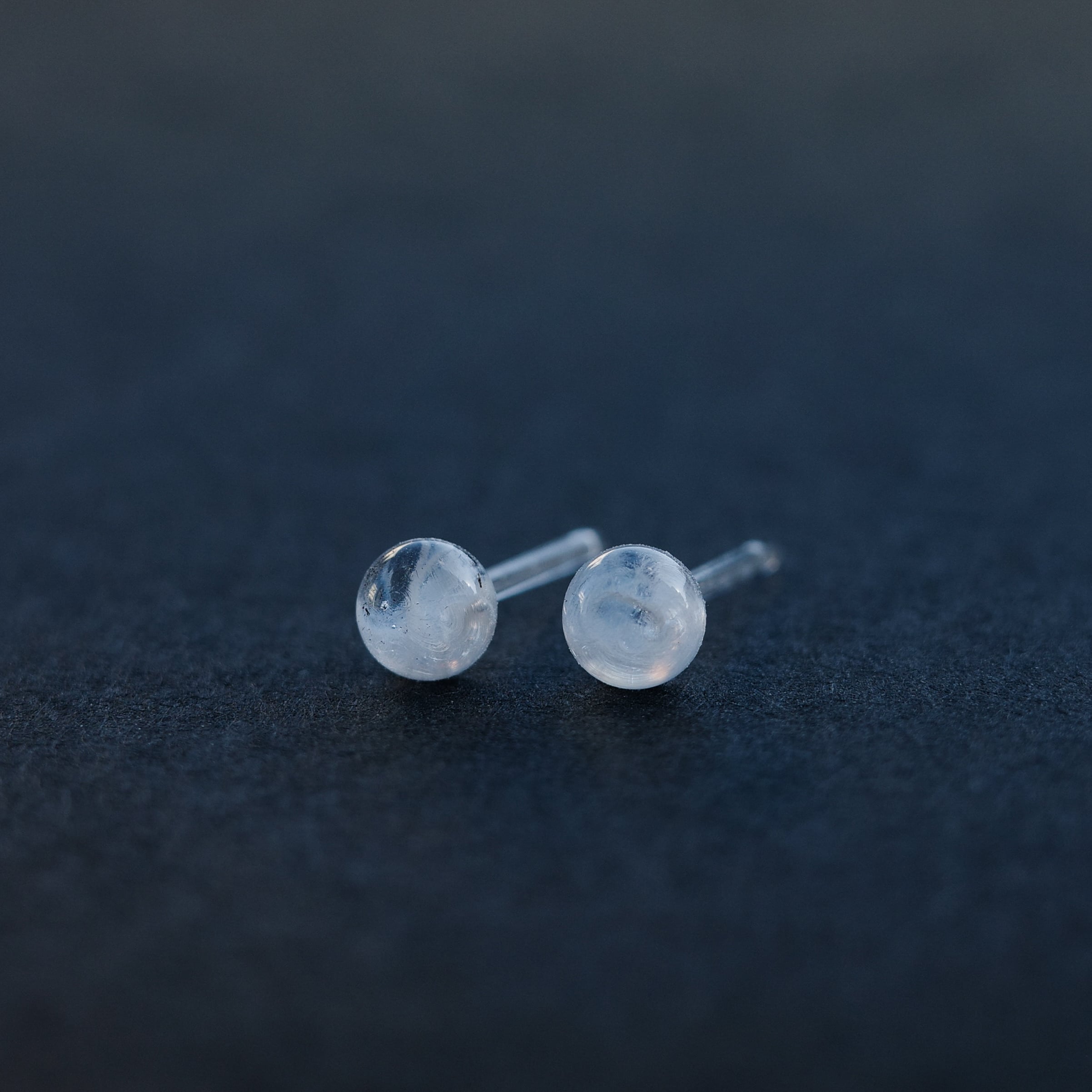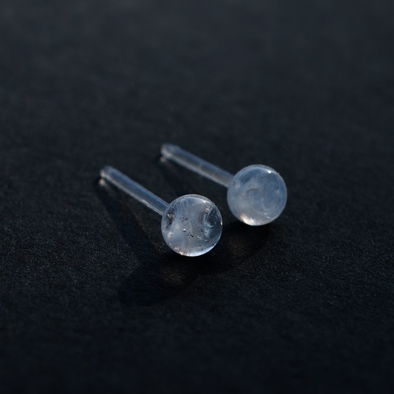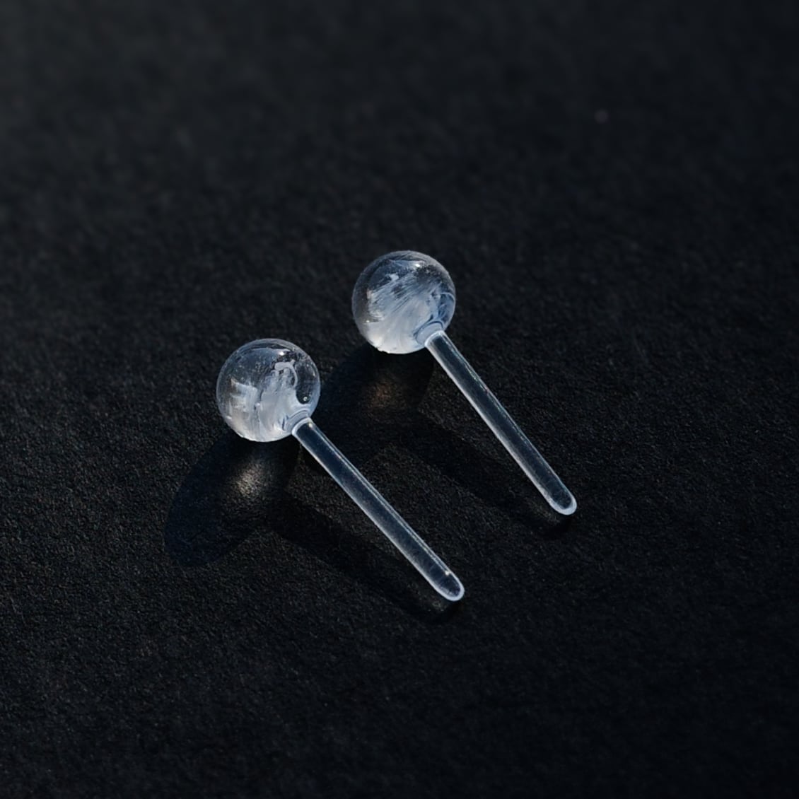 その中でも硬質ガラスは高い強度と透明度を誇っており、こちらのピアスはトップからシャフトまですべて一体の硬質ガラスを使用しております。